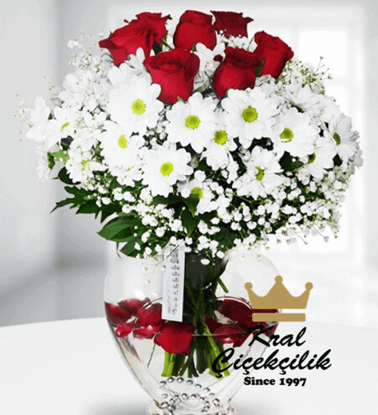 Şeffaf kalp vazoda papatya ve güller