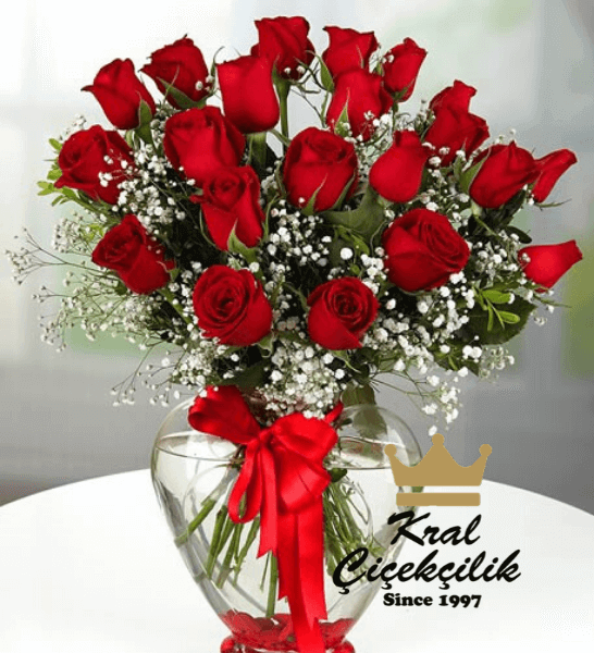 Şeffaf kalp vazo içinde 20 adet kırmızı gül