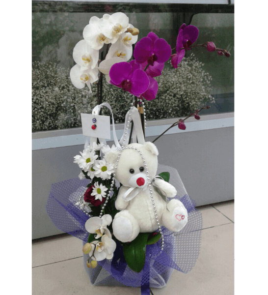 Orkide ve ayıcık ile çiçek aranjmanı