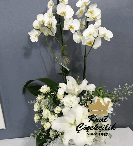 İthal Çift Dallı Orkide ve Beyaz Gül Lilyum Aranjmanlı